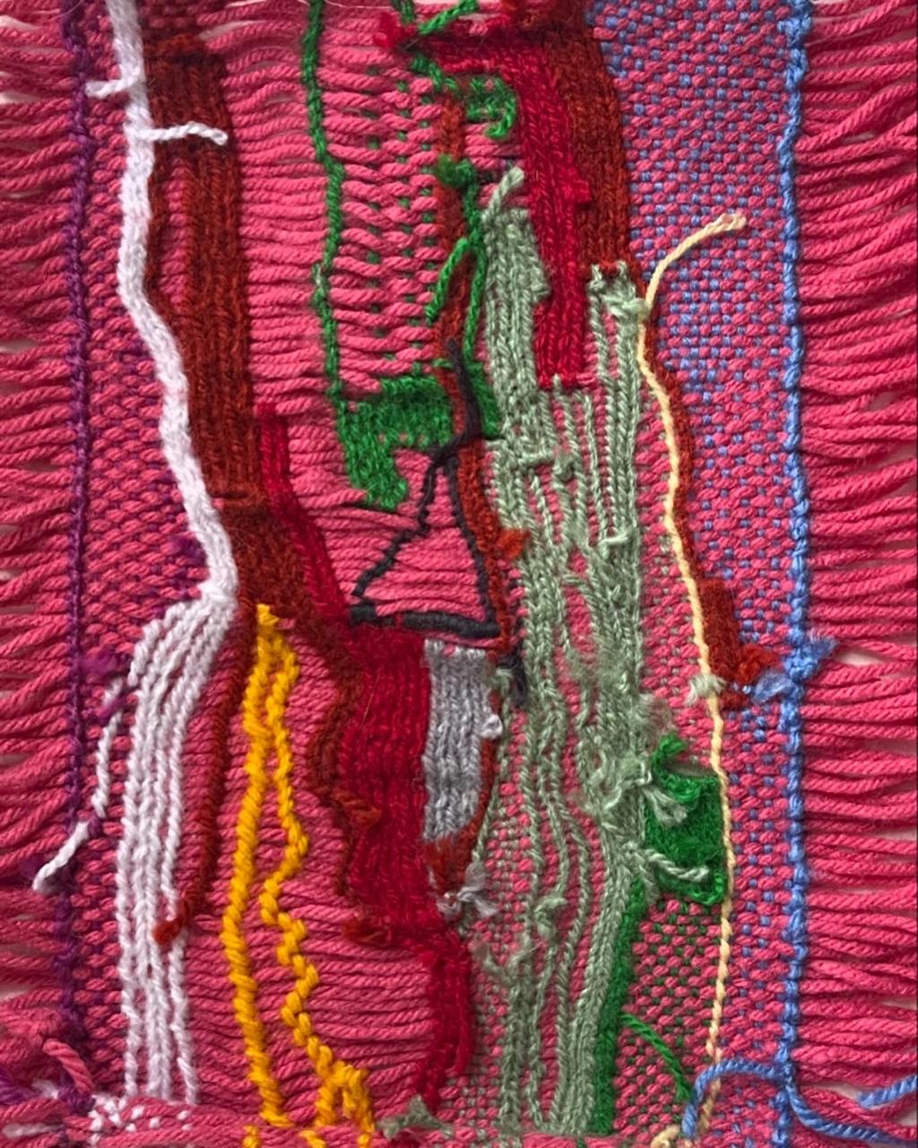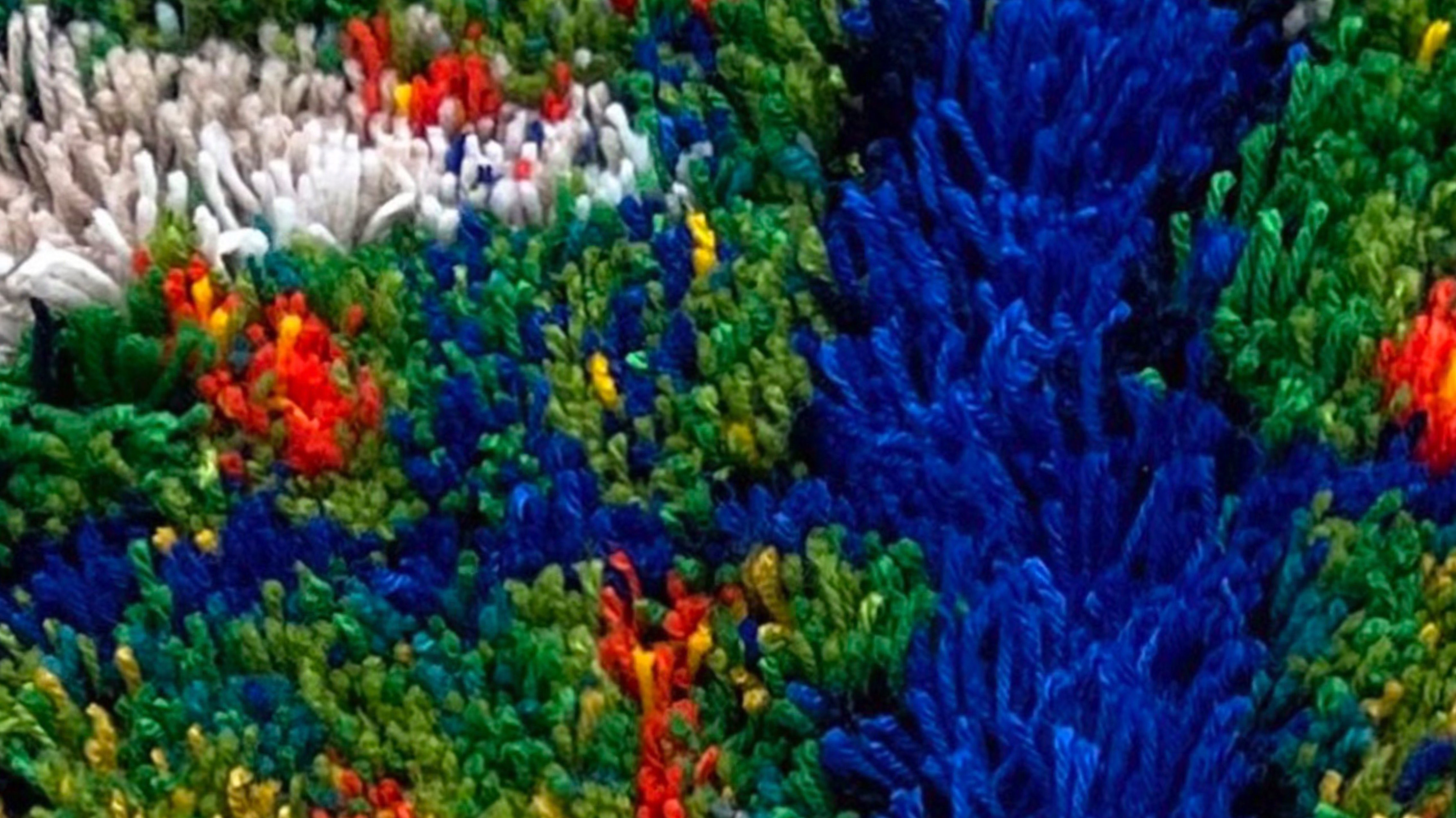 Andrea traza en sus textiles un recorrido vibrante en que chorrean lanas como un caótico torrente.
